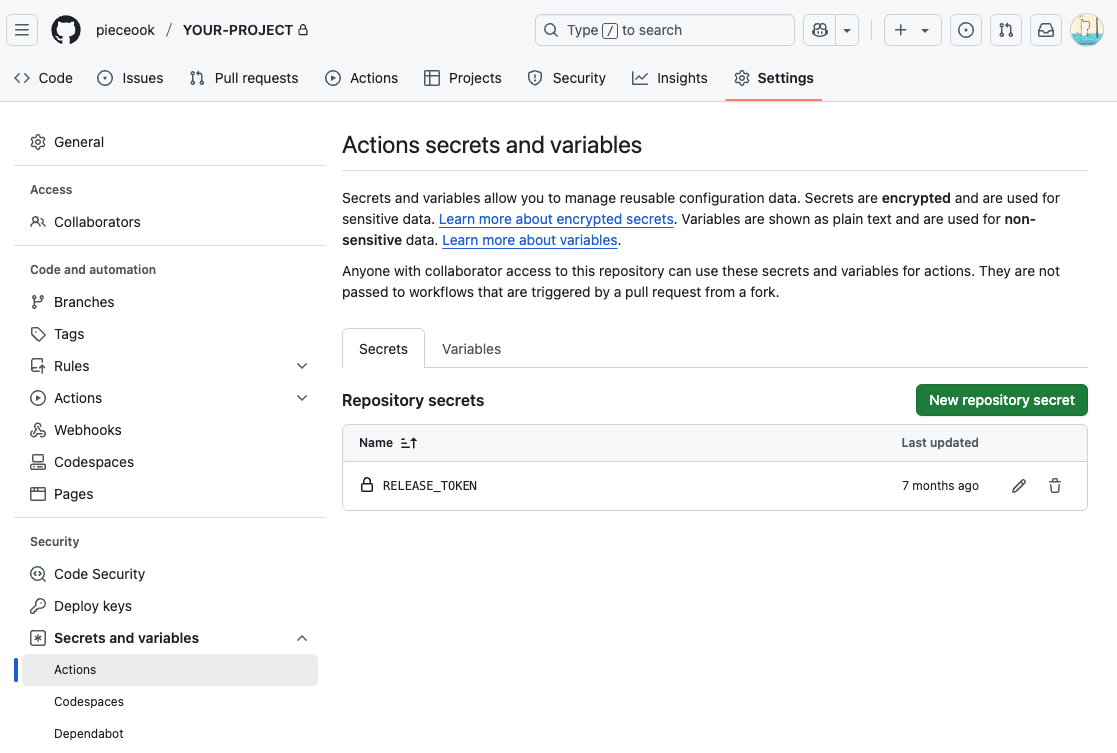 - 打开: ${Your Repository}->Settings->Secrets and variables